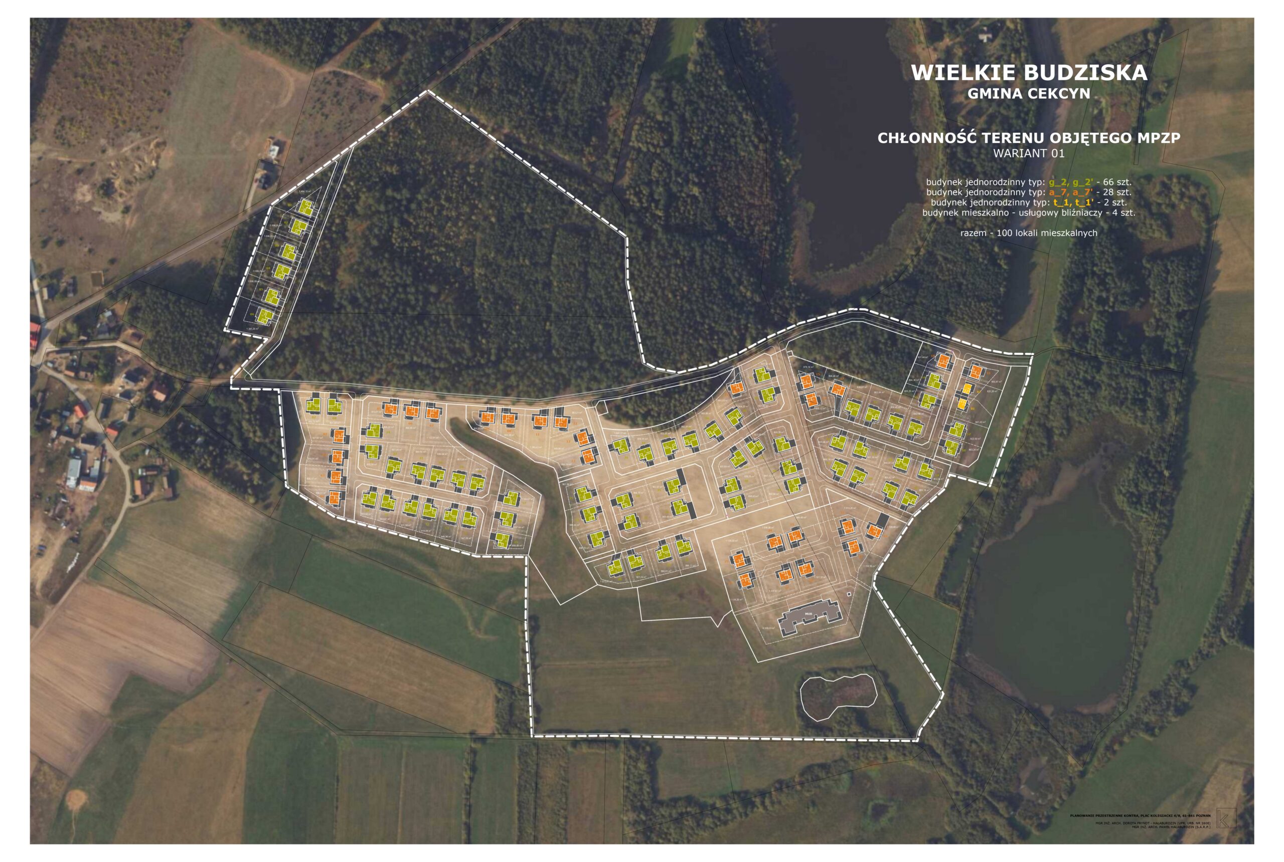 Pozwala na wybudowanie, w zależności od przyjętego wariantu, 100 domów jednorodzinnych do 209 lokali mieszkalnych w budynkach dwumieszkaniowych. Ponadto teren na hotel/pensjonat; otoczenie: lasy, łąki, woda; pełna swoboda planowania bez ograniczeń zewnętrznych.